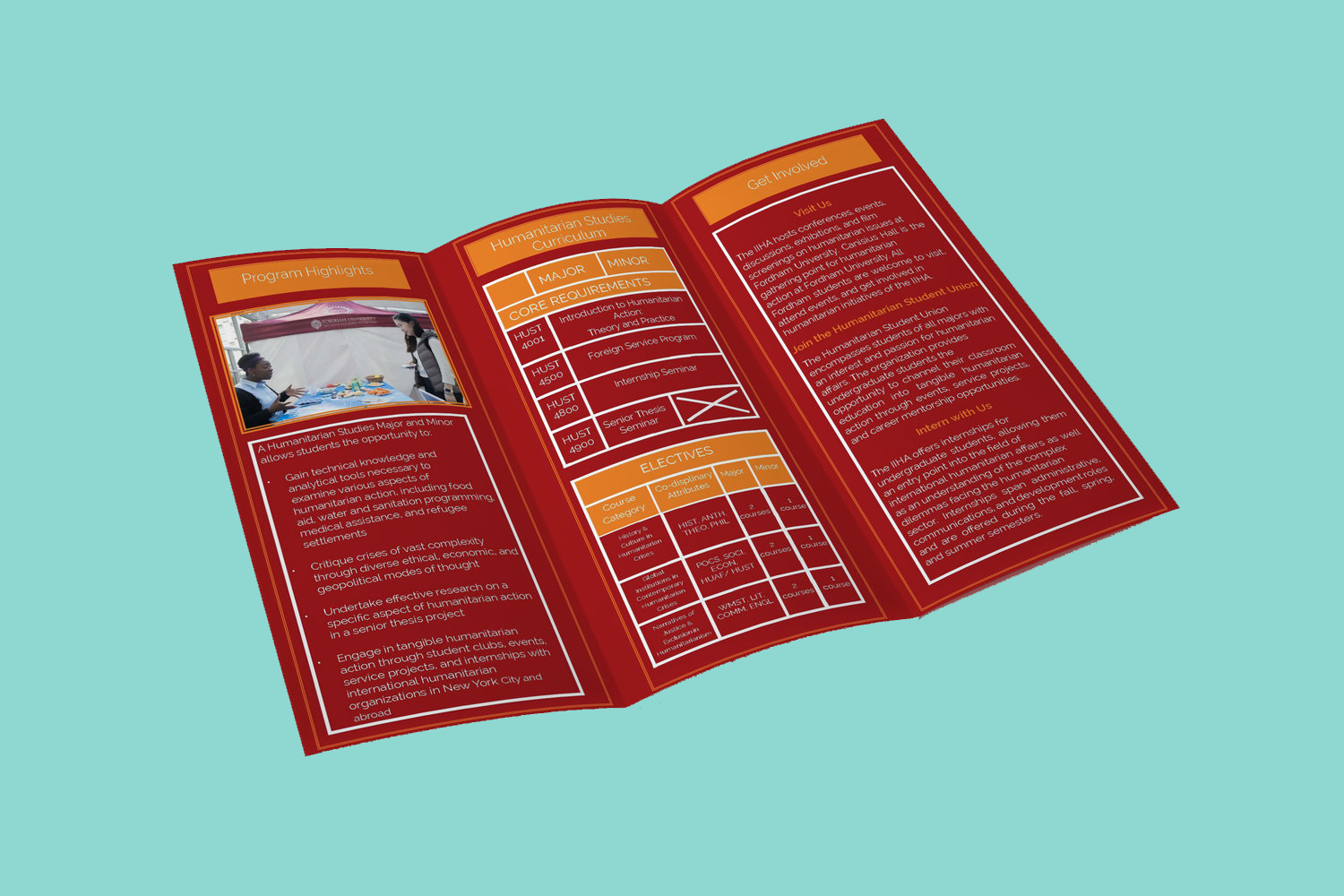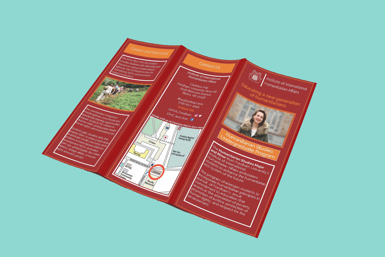 I was a graphic design intern at Fordham University’s Rosehill Institute of International Humanitarian Affairs office. My duties were to create social media content and marketing material advertising special classes. My biggest project was creating the institutes Major and Minor Undergraduate Brochure that is distributed at freshman orientations and Major day.