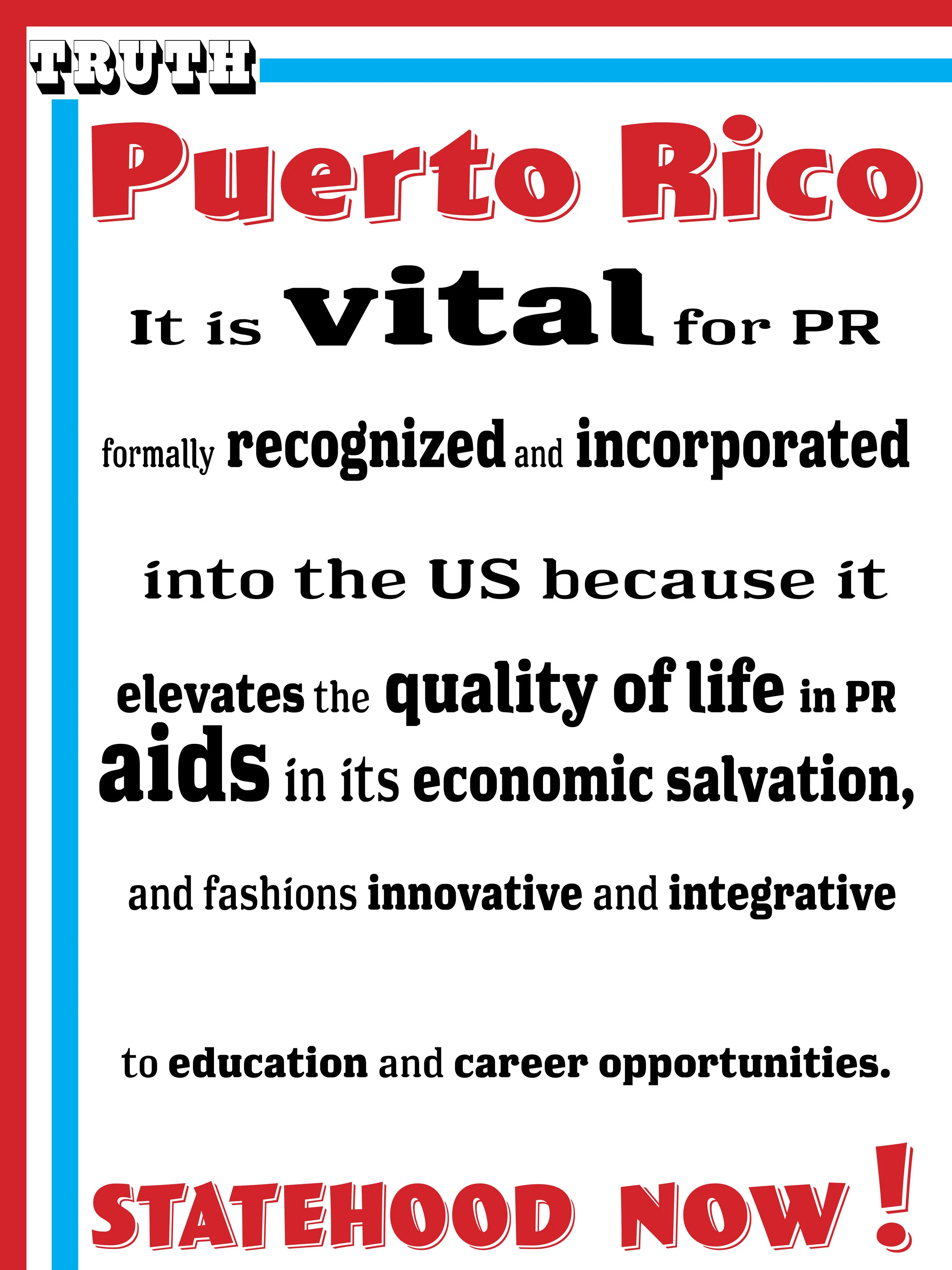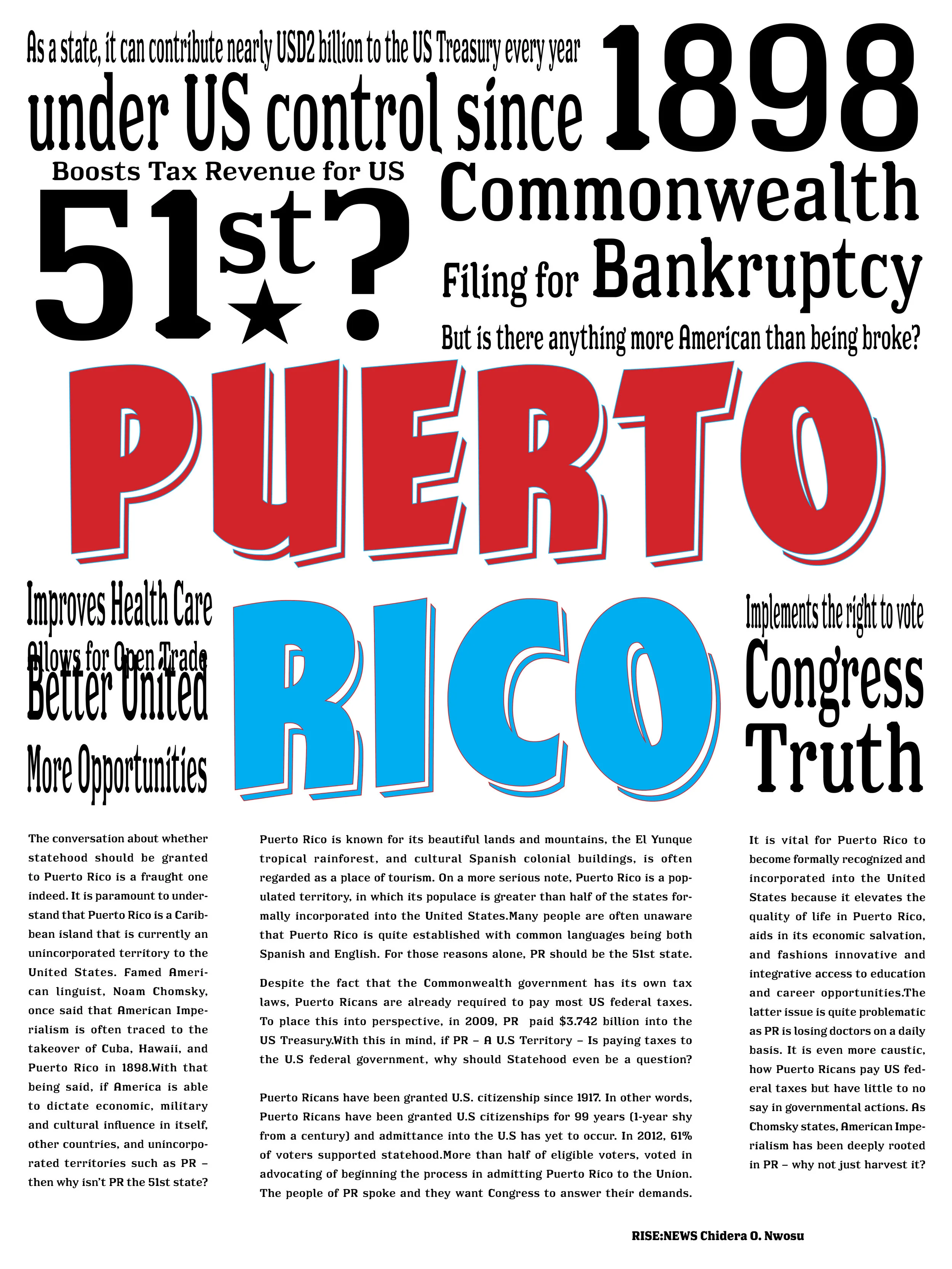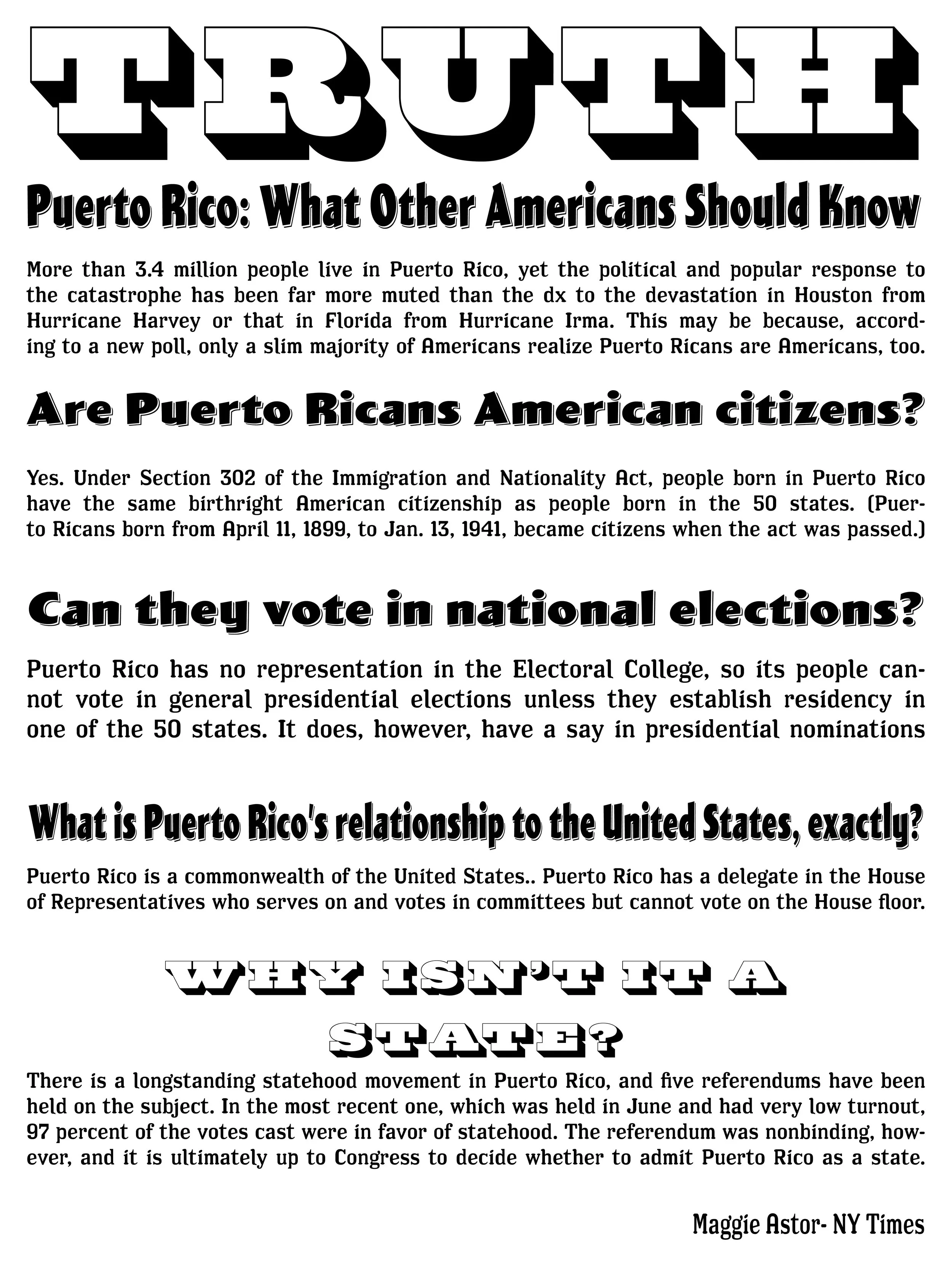 I identify as Puerto rican, when hurricane Maria struck the island it affected me deeply having family and friends who reside there. So when my Typography class assigned a poster project based on an important issue using an article, I chose the controversial topic of statehood for Puerto Rico as a way to possibly advertise a solution to Puerto Rico’s crisis.