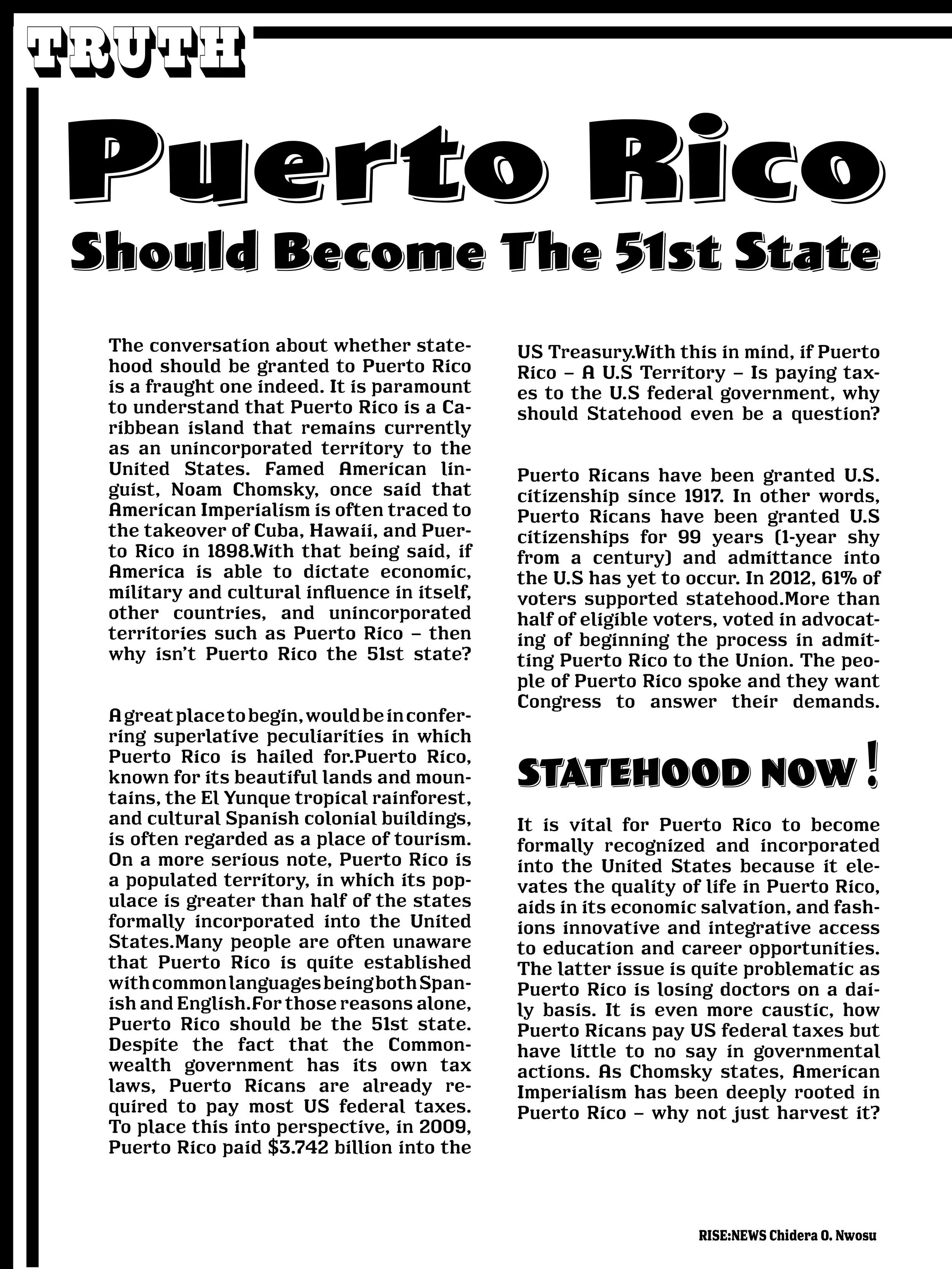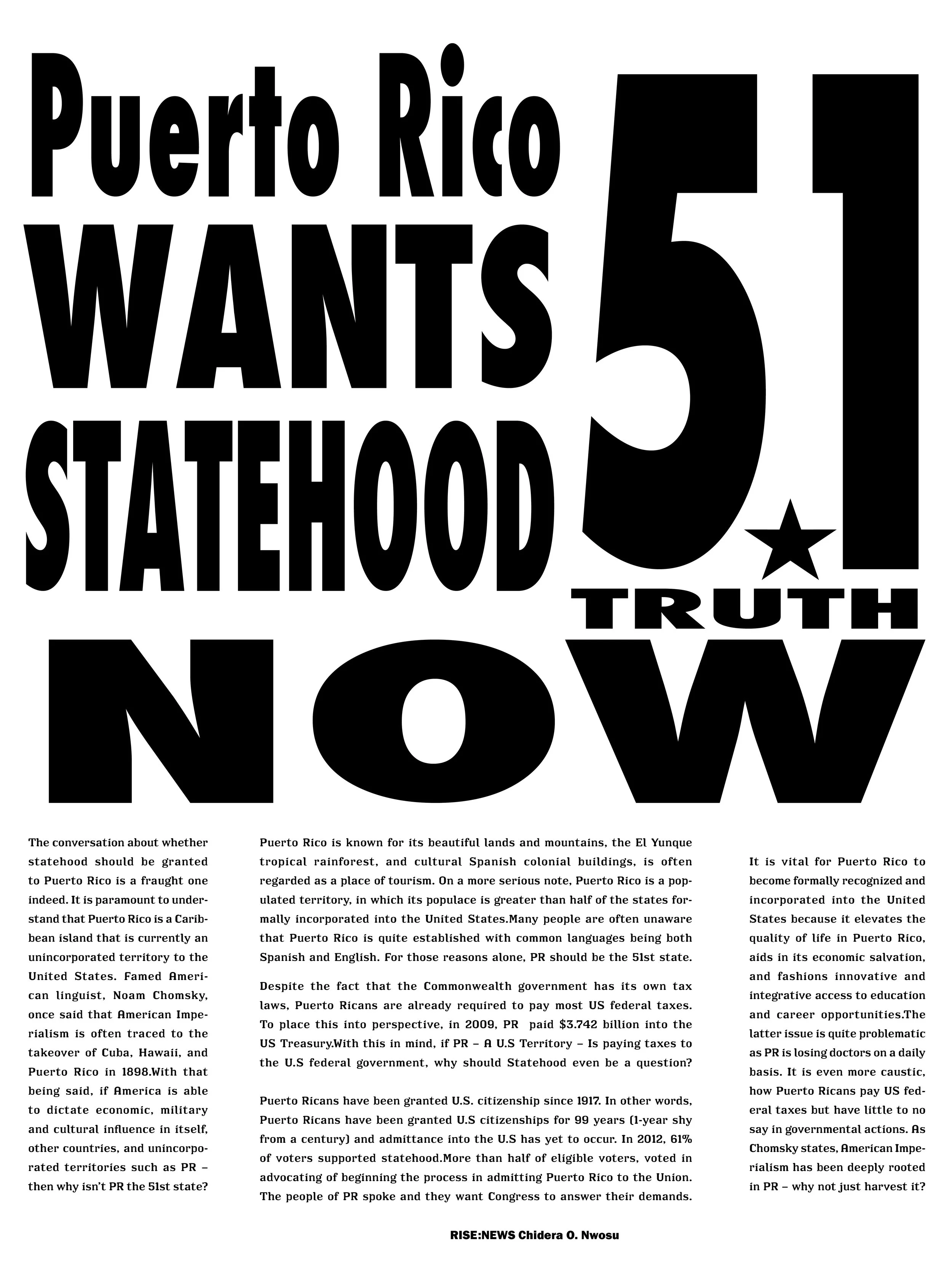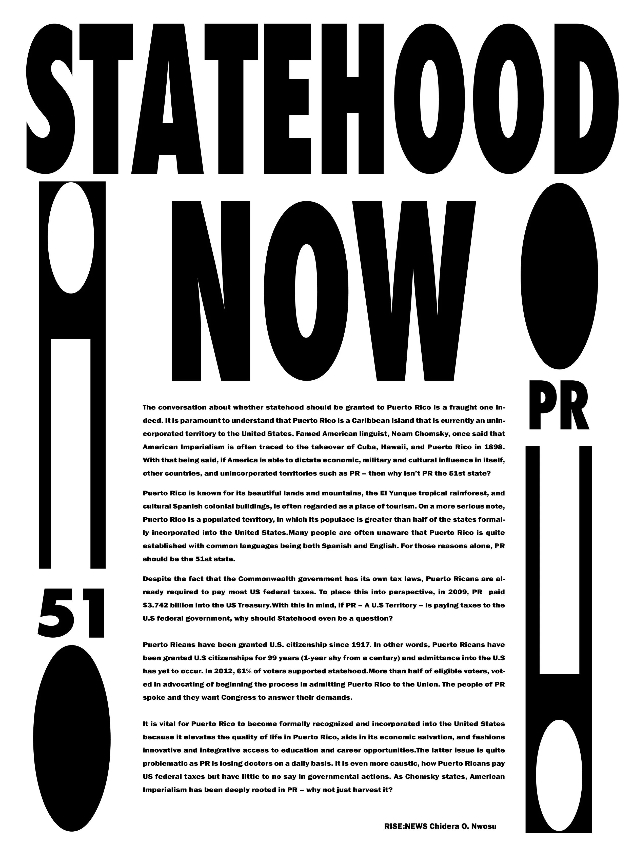 I identify as Puerto rican, when hurricane Maria struck the island it affected me deeply having family and friends who reside there. So when my Typography class assigned a poster project based on an important issue using an article, I chose the controversial topic of statehood for Puerto Rico as a way to possibly advertise a solution to Puerto Rico’s crisis.